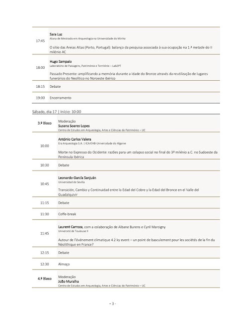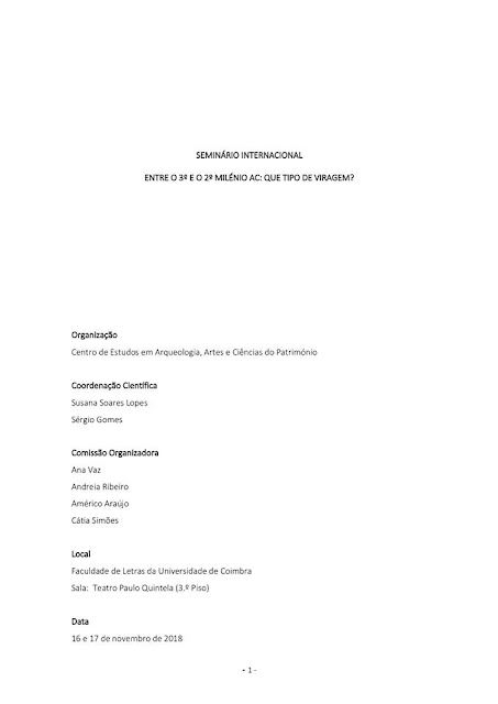 Já se encontra disponível o livro de Pré-Actas do Seminário Internacional "Entre o 3º e o 2º milénio a.C.: Que tipo de viragem?", que terá lugar na Faculdade de Letras da Universidade de Coimbra nos dias 16 e 17 de Novembro.